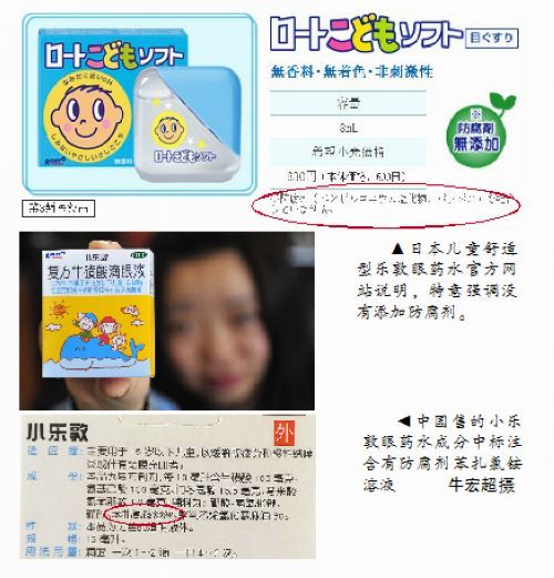 同款儿童用眼药水,中国销售的含有防腐剂,而日本销售的却不含。曼秀雷敦公司旗下的世界销量第一的滴眼液品牌乐敦(Rohto)中日执行双重标准,眼科专家指出含防腐剂儿童眼药水有健康隐患,呼吁跨国公司在全球应该执行同一最高标准。