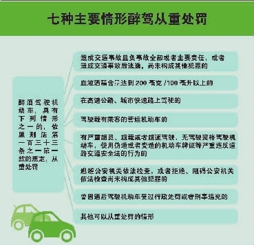 记者今日获悉,最高人民法院、最高人民检察院、公安部日前联合制定《关于办理醉酒驾驶机动车刑事案件适用法律若干问题的意见》(下称《意见》),进一步明确办理醉酒驾驶机动车刑事案件的有关法律适用问题。按照《意见》,在高速公路、城市快速路上醉驾,将受到从重处罚。 《意见》从醉驾发生实害后果、醉驾行为的危险性、行为人的主观恶性三个方面明确规定了七种醉酒驾驶机动车从重处罚的情形。按照《意见》,造成交通事故且负事故全部或者主要责任,或者造成交通事故后逃逸,尚未构成其他犯罪;血液酒精含量达到200毫克/100毫升以上;在高速公路、城市快速路上驾驶;驾驶载有乘客的营运机动车;有严重超员、超载或者超速驾驶,无驾驶资格驾驶机动车,使用伪造或者变造的机动车牌证等严重违反道路交通安全法的行为;逃避公安机关依法检查,或者拒绝、阻碍公安机关依法检查尚未构成其他犯罪;因酒后驾驶机动车受过行政处罚或者刑事追究等七种醉驾情形,应从重处罚。 《意见》规定,“醉酒驾驶机动车,以暴力、威胁方法阻碍公安机关依法检查,又构成妨害公务罪等其他犯罪的,依照数罪并罚的规定处罚”。 针对实践中发生的犯罪嫌疑人为逃避法律追究,在检查时当场饮酒的情况,《意见》明确规定,犯罪嫌疑人在呼气酒精含量检验或者抽取血样前又饮酒,经检验其血液酒精含量达到本意见规定的醉酒标准的,应当认定为醉酒。 据悉,《意见》还对公安机关办理醉驾案件收集证据以及醉酒的认定依据等作出明确规定。