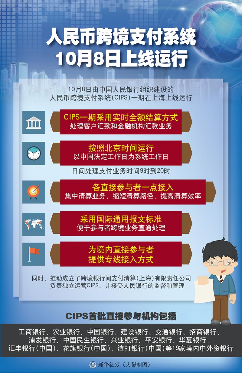 2015年10月8日,人民币跨境支付系统(一期)成功上线运行。人民币跨境支付系统(CIPS)为境内外金融机构人民币跨境和离岸业务提供资金清算、结算服务,是重要的金融基础设施。该系统按计划分两期建设,一期工程便利跨境人民币业务处理,支持跨境货物贸易和服务贸易结算、跨境直接投资、跨境融资和跨境个人汇款等业务。其主要功能特点包括:一是CIPS(一期)采用实时全额结算方式处理客户汇款和金融机构汇款业务。二是各直接参与者一点接入,集中清算业务,缩短清算路径,提高清算效率。三是采用国际通用ISO20022报文标准,便于参与者跨境业务直通处理。四是运行时间覆盖欧洲、亚洲、非洲、大洋洲等人民币业务主要时区。五是为境内直接参与者提供专线接入方式。